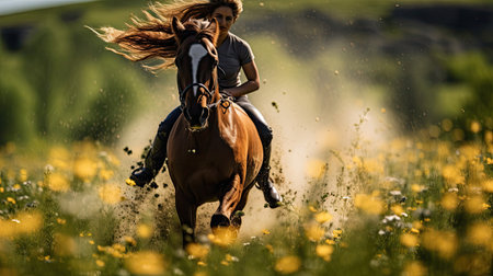Rider and horse charge through field wind whipping vibrant field colors confident stance exhilaration