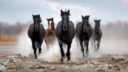 A dynamic scene captures a group of stunning horses galloping through a dusty landscape, embodying freedom and natural beauty against a moody sky.