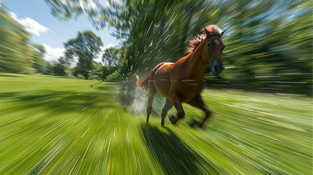 A brown horse is seen galloping through a vibrant green field, showing its speed and strength in a natural setting. The field is lush and full of life, providing a picturesque backdrop to the horses powerful movement.