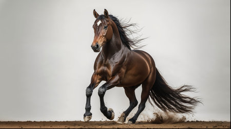 A powerful and dynamic image of a brown horse galloping across a dirt arena. Generative Ai
