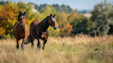 Three brown horses captured in full gallop amid a misty, sunlit meadow, portraying motion and the tranquil beauty of nature. AI Generation