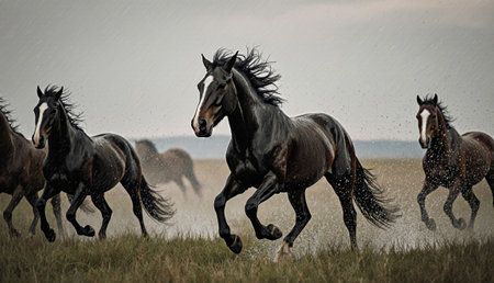 A group of majestic horses runs freely through a grassy field, their manes flowing in the wind. Dark clouds loom above, adding a sense of drama to the serene landscape.