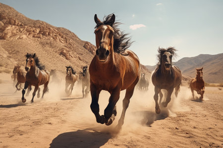 A dynamic image capturing a herd of horses running across a dirt field. This picture can be used to depict freedom, power, and the beauty of nature. Suitable for various projects, such as equestrian-themed designs, sports-related content, or even illustrating the concept of teamwork and unity.