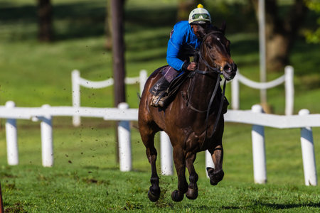A jockey rushes to the finish line on his horse during a race. A traditional European sport.