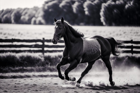 A stunning black and white image showcasing a horse galloping through a dusty landscape, capturing the essence of wild beauty and freedom.