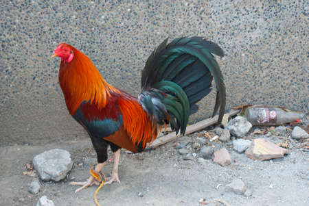 Beautiful cocks sitting under the wall on the street tied to a rope. Manila, Philippines