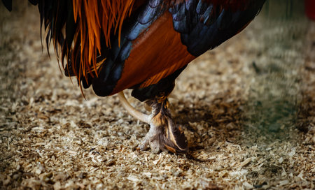 A spurs of rooster close-up. Cock paw closeup. Livestock and farming.