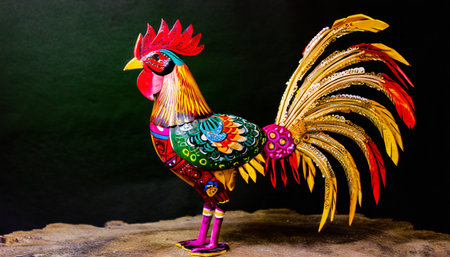 Colorful rooster made of wood on a black background, Thailand.
