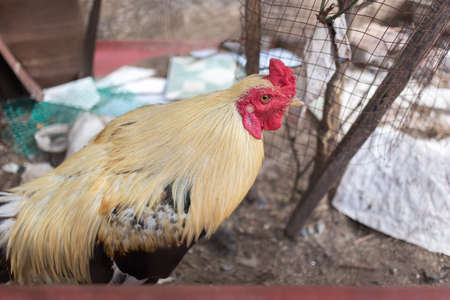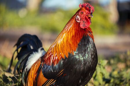 Beautiful color Rooster on nature background, Feed poultry outdoor