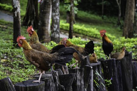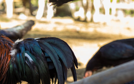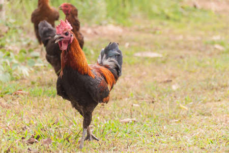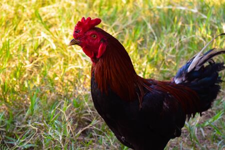 Thai brown Chicken with red head and black tail, selective focus