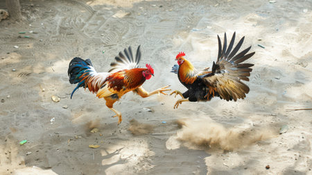 Two roosters engage in a fierce battle on a sandy ground. One rooster stands with its wings spread wide, while the other leaps into the air, kicking its legs forward. The dust and debris from the fight create a cloud around them.