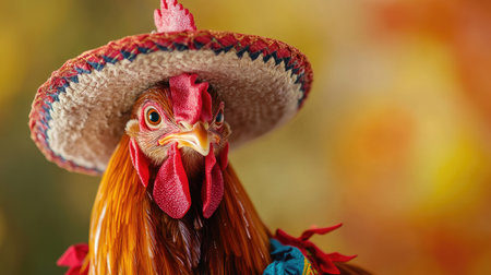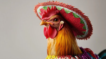 A cute chicken cockerel in a Mexican sombrero and outfit, captured in a bright studio shot, full of personality and flair.
