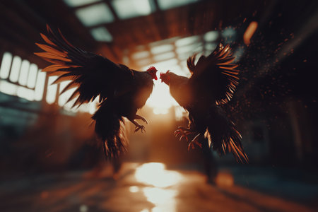 Two roosters engage in a fierce fight under dramatic lighting, capturing the essence of aggression and excitement in this stunning action shot.