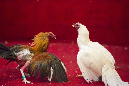 OTAVALO, ECUADOR, FEBRUARY 28: Two chickens fighting into a red ring in Otavalo, Ecuador. The cockfight is a popular sport and part of the tradition of Ecuador. 2015