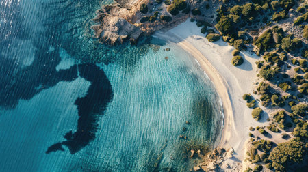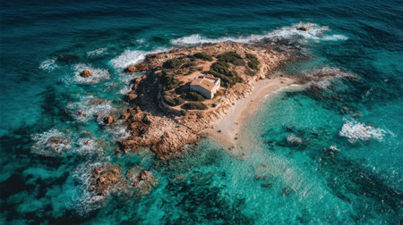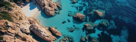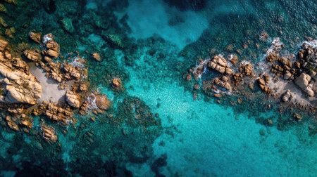 An aerial view of a coastal beach with rocks, surrounded by electric blue water. Natural landscape with oceanic and fluvial landforms, including reefs and lakes AIG50