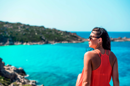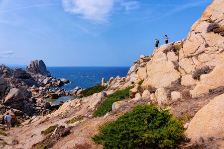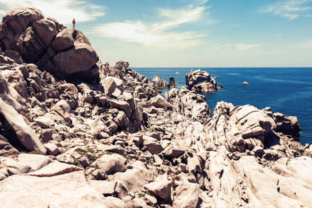 Couple looking at rocks of Capo Testa at the Mediterranean sea in Santa Teresa Gallura province in Sardinia island in Italy. Scenery with person in Sardegna.