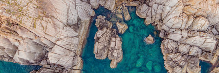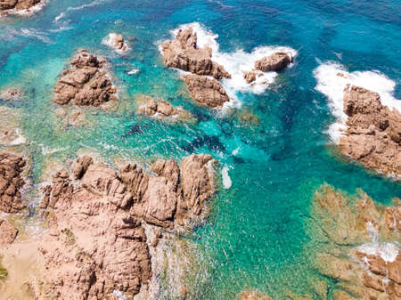Aerial photo over granite rocky coastline Mediterranean crystal clear blue sea water. Aerial photo of ocean waves hitting rocky coastline of beautiful paradise dream tropical beach. Sardinia, Italy.