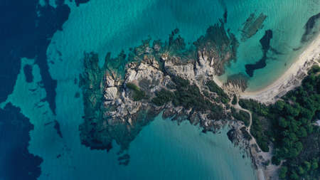 Aerial view of Vourvourou beach, small peninsula in turquoise water of Aegean sea. Waves beating cliff rocky coastline. Halkidiki, Greece.