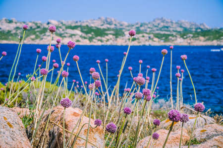 Wild onion leek growing between granite rocks on beautiful Sardinia island . Blue see and an other island on background, Sardegna, Italy