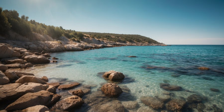 AI Generated. Beautiful coastal landscape with clear turquoise water and rocky shoreline under a bright blue sky