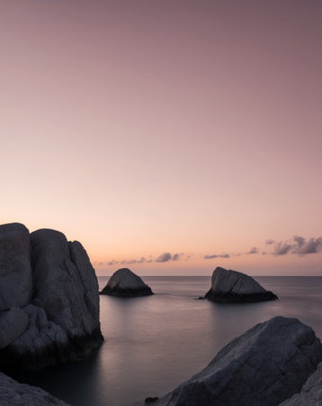 Long exposure image of dramatic orange & purple sunrise over the Mediterranean sea and large granite boulders on the coast of Cavallo Island n the Lavezzi archipelago of Corsica