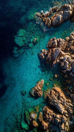 An overhead view reveals a vivid turquoise sea juxtaposed with brown rocks. The image captures a textured composition of natural elements. The scene, possibly coastal, suggests outdoor environments. This image can be suitable for various commercial uses, including website backgrounds and marketing materials.