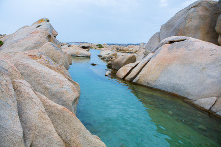 Cute bay surrounded by sand rocks near Porto Rafael, Palau, Sardinia, Italy.