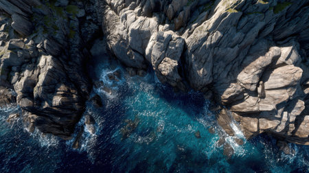 This aerial view showcases a rocky coastline meeting a body of water, creating a rugged and striking landscape. The rocks jut out into the water, with waves crashing against them, creating a dynamic and textured scene.