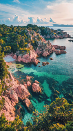 The Pink Granite Coast showcases unique pink-hued rocks and crystal-clear waters, surrounded by lush greenery under the soft light of late afternoon.