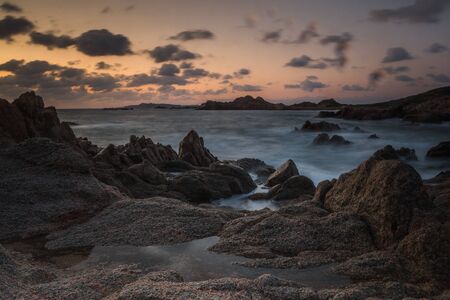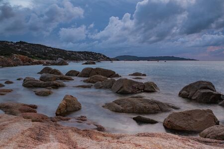 Romantic sunrise at Capriccioli Beach at Sardinia island in Italy. Sky with clouds. Stones and rocks.