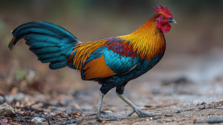 A vibrant rooster with colorful plumage standing proudly in a rural setting, its sharp beak and claws showing the readiness for an upcoming cockfight.