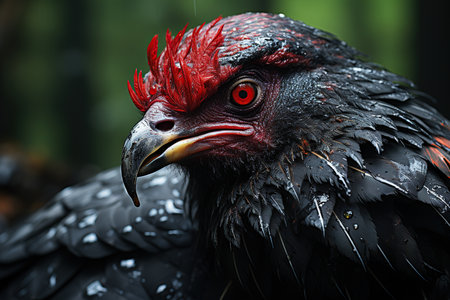 Close-up portrait of a big black chicken with red feathers.
