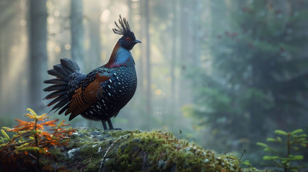 A capercaillie displays its vibrant plumage on a rock, surrounded by mist and trees at dawn