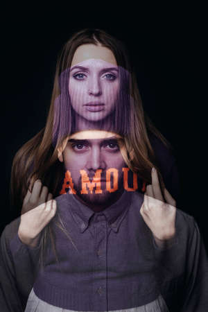 Double exposure photo of young pretty woman and handsome bearded man looking at camera piercingly on black background