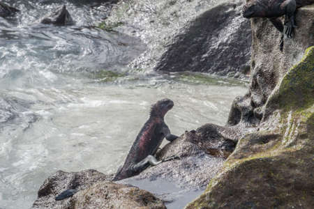 marine iguana, Amblyrhynchus cristatus, also sea, saltwater, or Galápagos marine iguana sitting on the lava rocks of the galapagos islands soaking up the sun