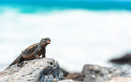 Colorful prehistoric dragon on black volcanic stones on Galapagos islands.