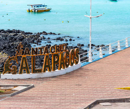 GALAPAGOS ISLAND, SANTA CRUZ - JULY 2, 2019: 3D letters Santa Cruz Galapagos at the pier