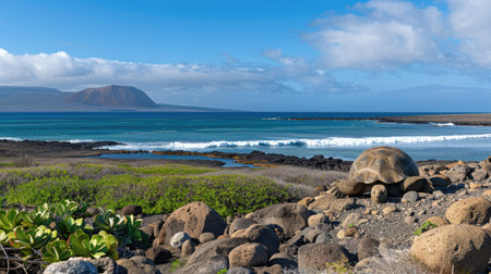 A Galapagos Tortoise, traversing the volcanic landscape, each step reverberating with centuries of existence