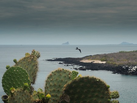 Overviewing the pacific and Kicker rock over the cactus landscape of Galapagos, Ecuador
