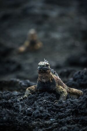 Two marine iguanas looking at each other. Selective focus on the animals, background is out of focus.