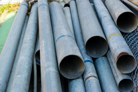 open-air market of steel products in the city. a lot of different building material from iron . pipes and tubes .