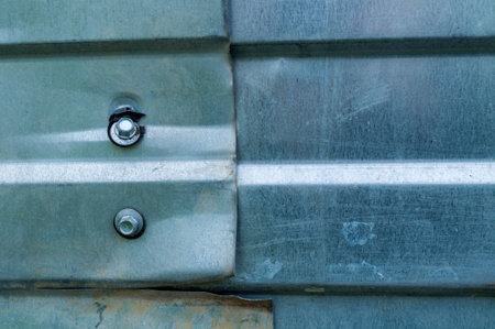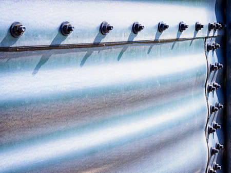 metal beam, silver color support with bolts, clean metal construction texture with copy space. Top view building element. Industrial abstract background with steel structure with rivets