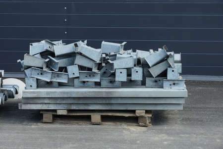 a bunch of gray metal parts and corners on the asphalt on the street against a black wall