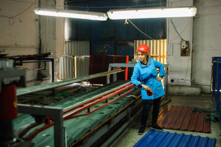 beautiful woman in red safety helmet work as industrial worker at metal sheet profiling mechine at manufacturing factory