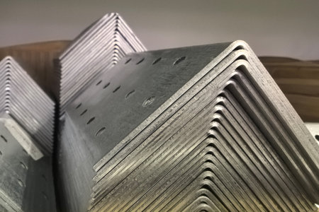 Neatly arranged metal plates display precision and craftsmanship in a busy workshop. Each piece reflects light and showcases details of drilling and cutting, ready for upcoming projects.