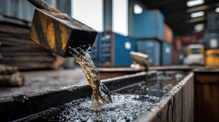 A dynamic scene capturing hydraulic fluid flowing from a metal tool into a container, showcasing the industrial processes in a warehouse environment.