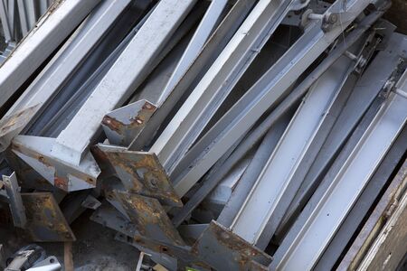 Group of the metal frame and equipment pile on the concrete ground sheet for use to built the construction frame of the monorail station in the urban area.