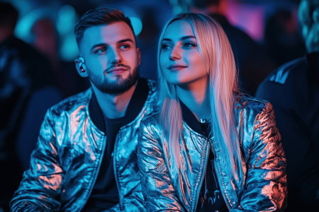 A couple sits together, immersed in colorful lights and enjoying the music at a lively nightlife event.