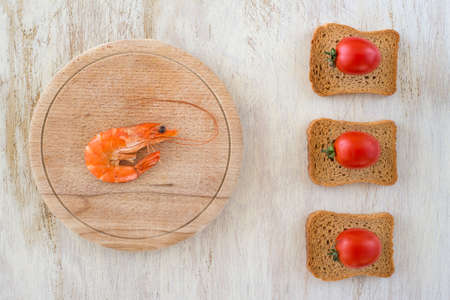 composition with a shrimp tomatoes and rusks on a kitchen table