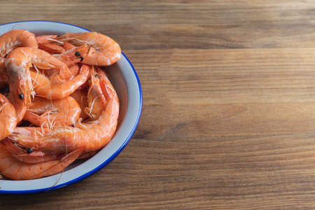 White plate full of cooked shrimps on wooden background. Copyspace.